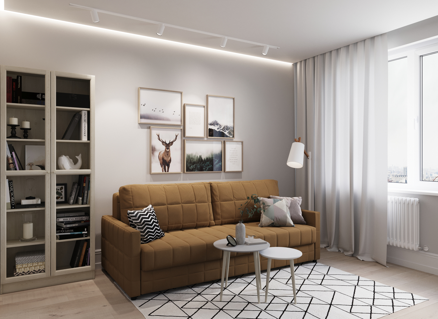 Синка, выполненная в обивочной ткани, позволяет ставить диван в центре комнаты и зонировать пространство.