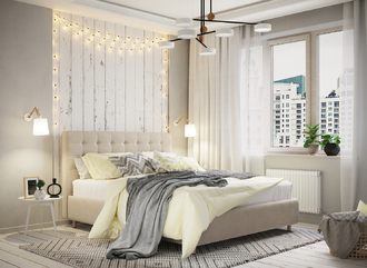 Обратная сторона изголовья выполнена в мебельной ткани и позволяет ставить кровать в центре комнаты для зонирования пространства.