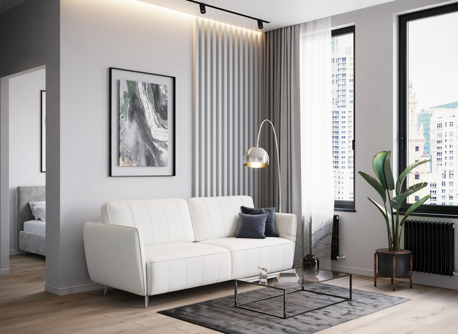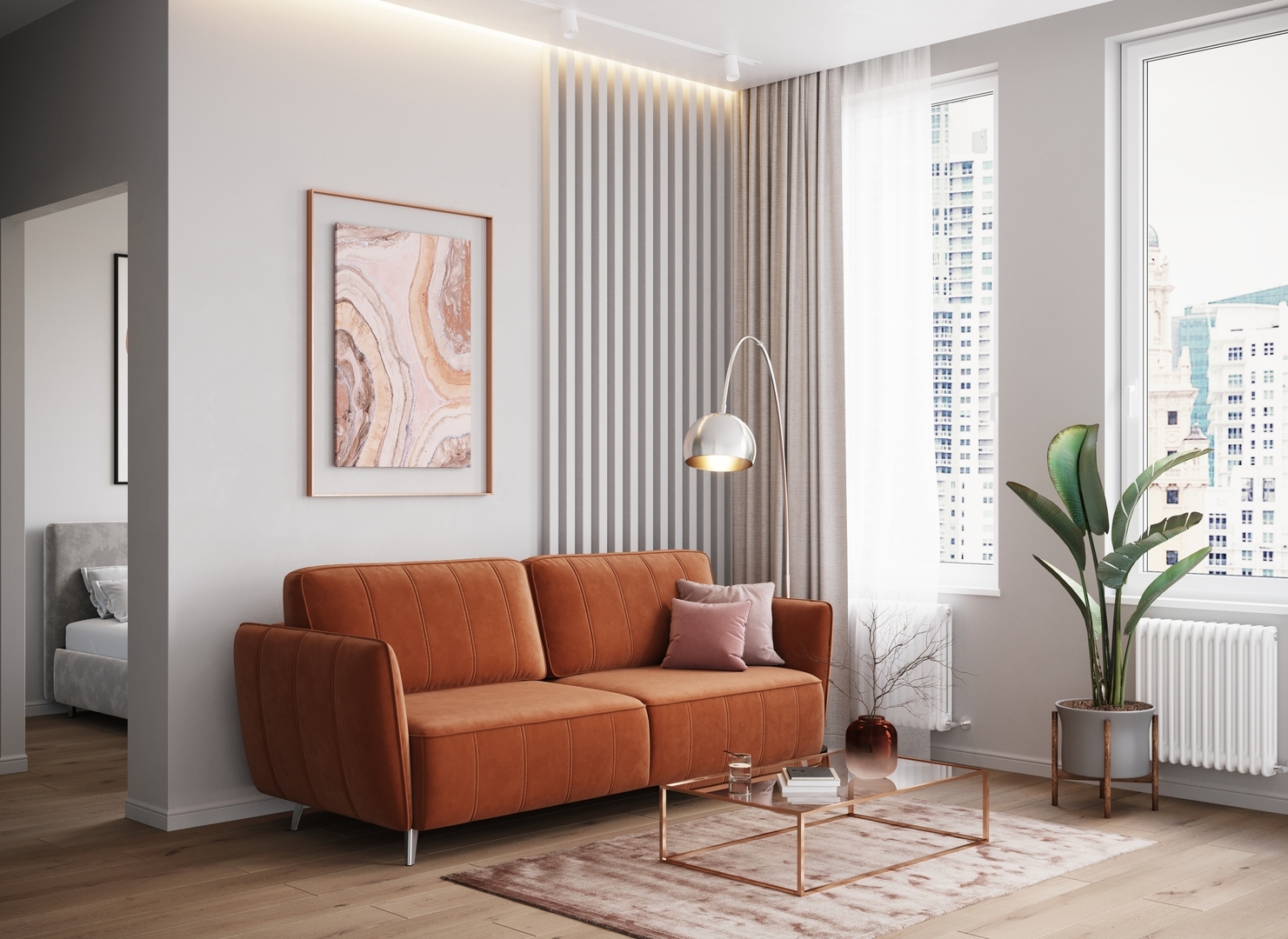 Спинка, выполненная в обивочной ткани, позволяет ставить диван в центре комнаты и зонировать пространство.