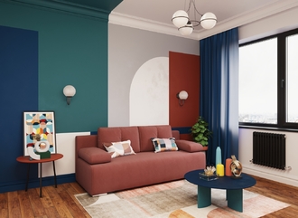 Спинка, выполненная в обивочной ткани, позволяет ставить диван в центре комнаты и зонировать пространство.