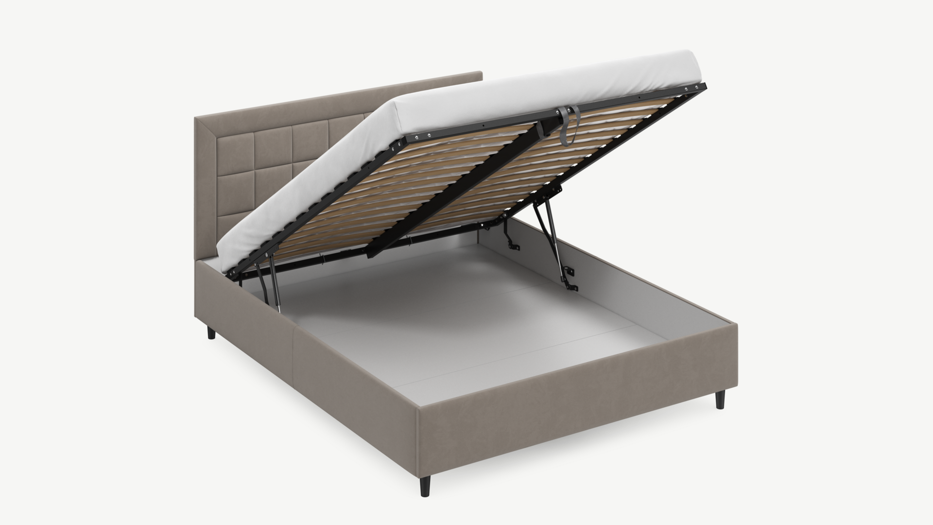 Вместительная емкость под кроватью без внутренних перегородок позволяет использовать для хранения вещей 100% пространства.