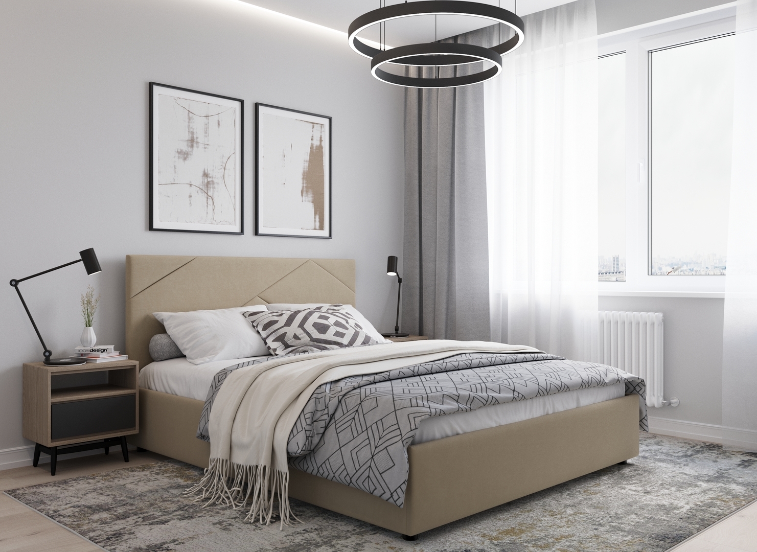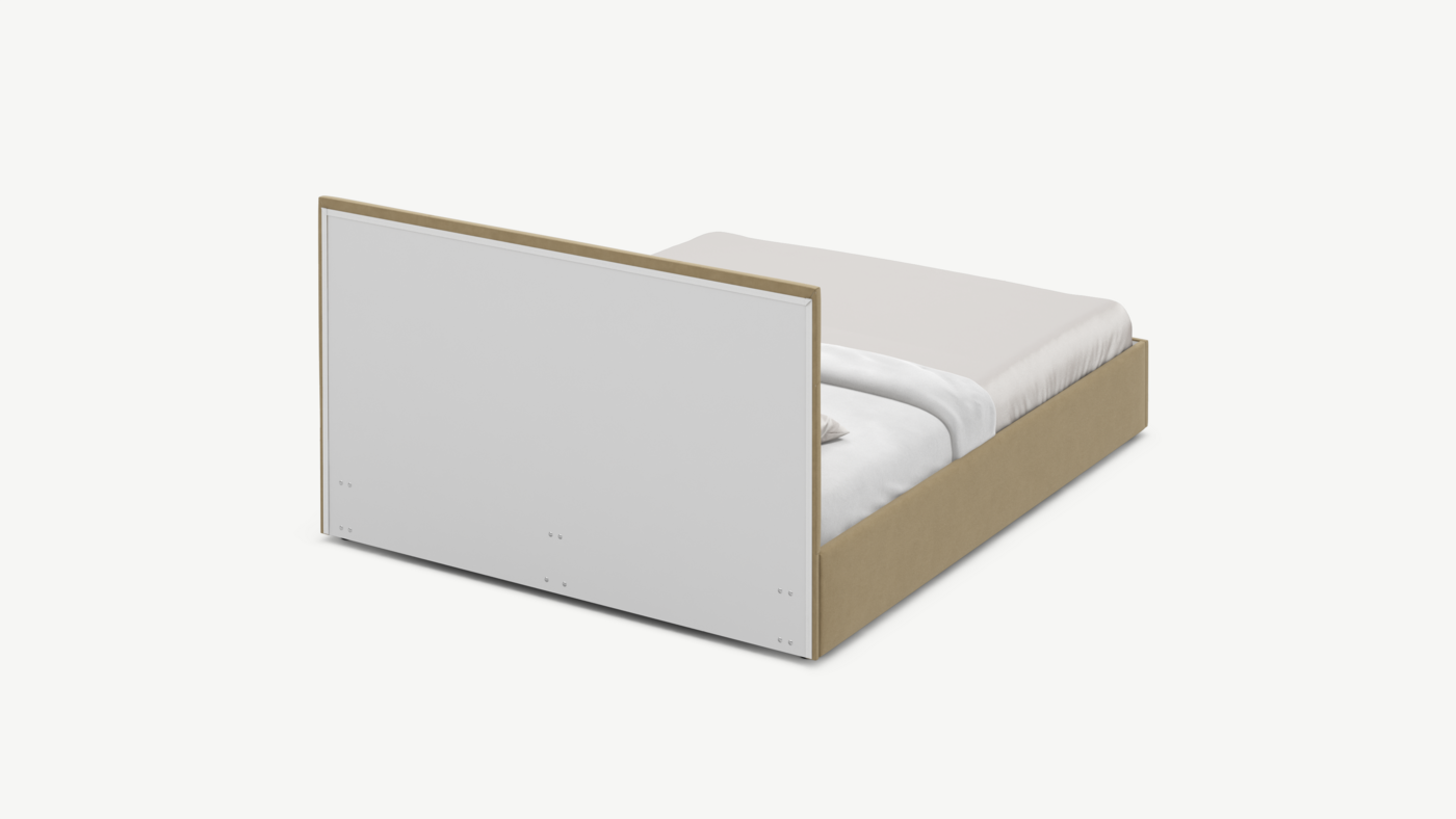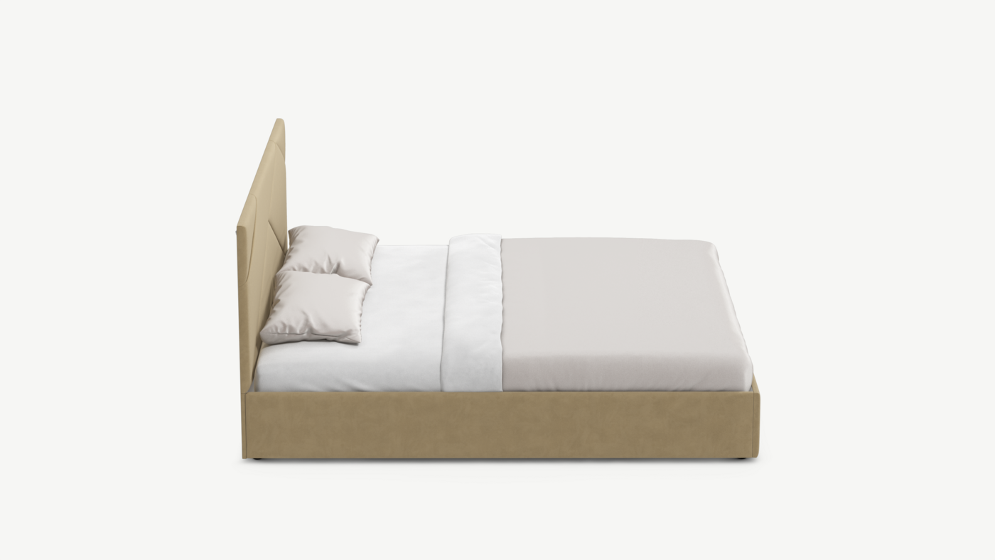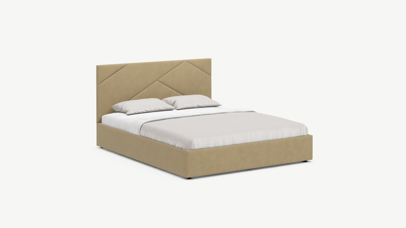 MOON FAMILY 1257 привлекает внимание оригинальным исполнением: широкие полосы ткани эффектно пересекают периметр изголовья, создавая на нем графический орнамент. Элегантным и практичным акцентом служат скрытые карманы, расположенные по его углам. Лаконичные формы объемных царг создают единый гармоничный образ и фокусируют внимание на центральном текстурном элементе кровати.