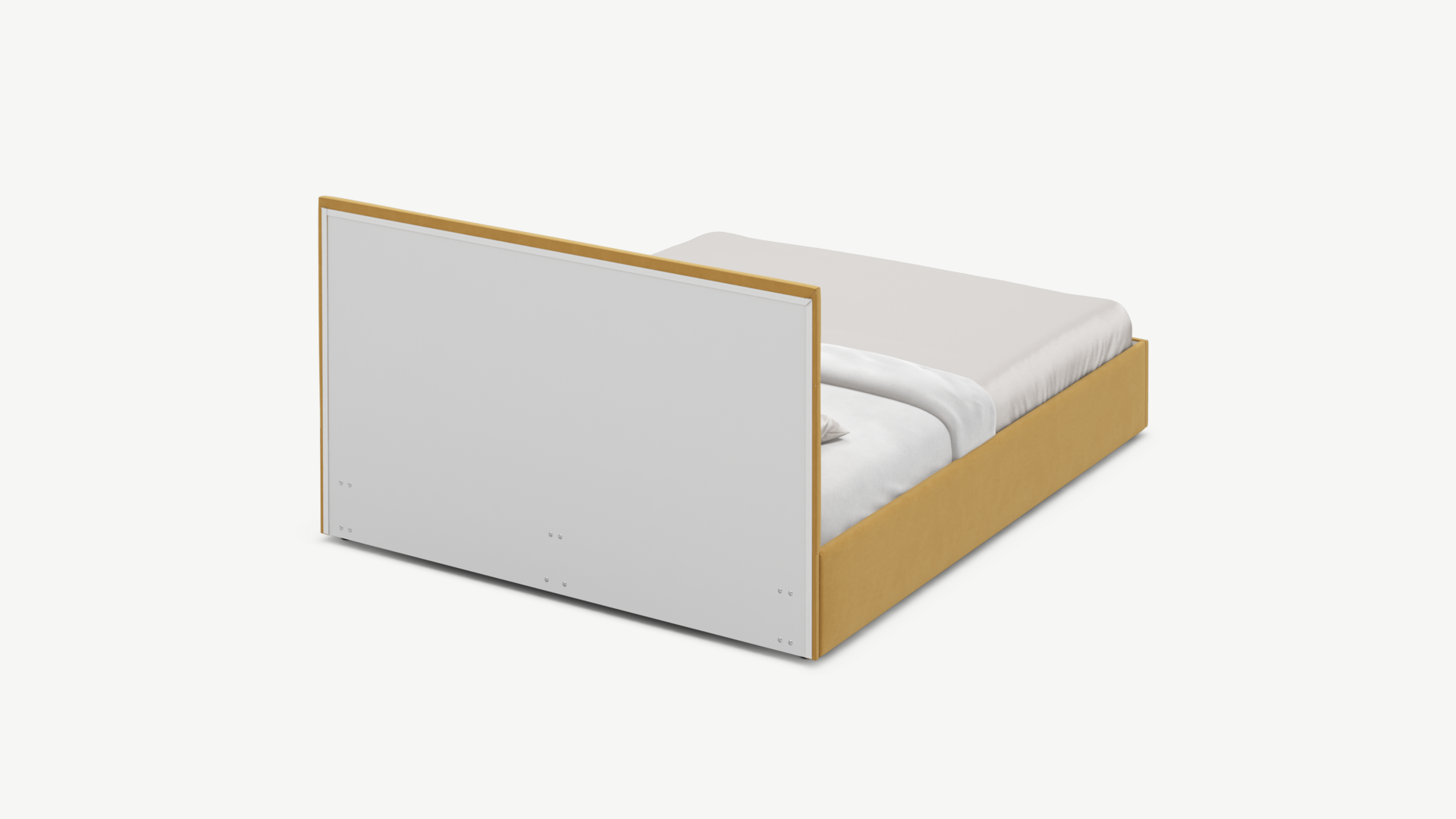MOON FAMILY 1257 привлекает внимание оригинальным исполнением: широкие полосы ткани эффектно пересекают периметр изголовья, создавая на нем графический орнамент. Элегантным и практичным акцентом служат скрытые карманы, расположенные по его углам. Лаконичные формы объемных царг создают единый гармоничный образ и фокусируют внимание на центральном текстурном элементе кровати.