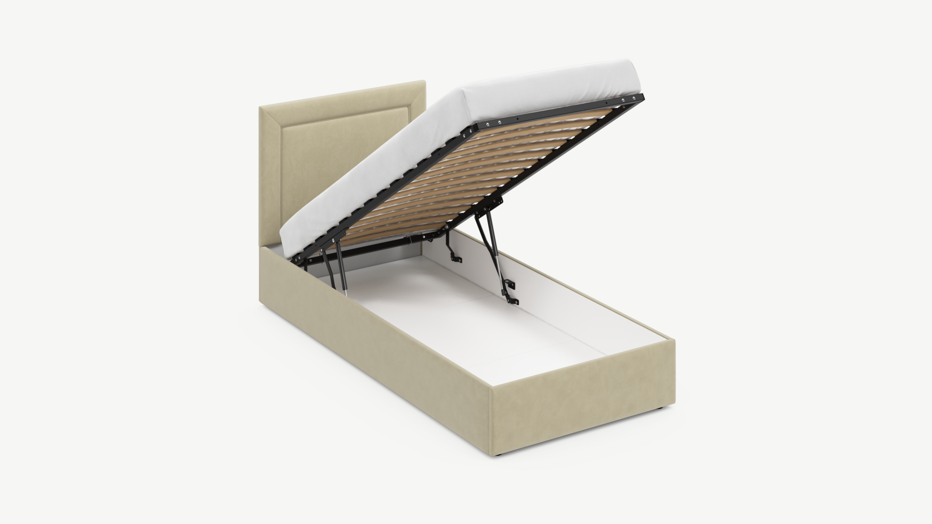 Вместительная емкость под кроватью без внутренних перегородок позволяет использовать для хранения вещей 100% пространства.