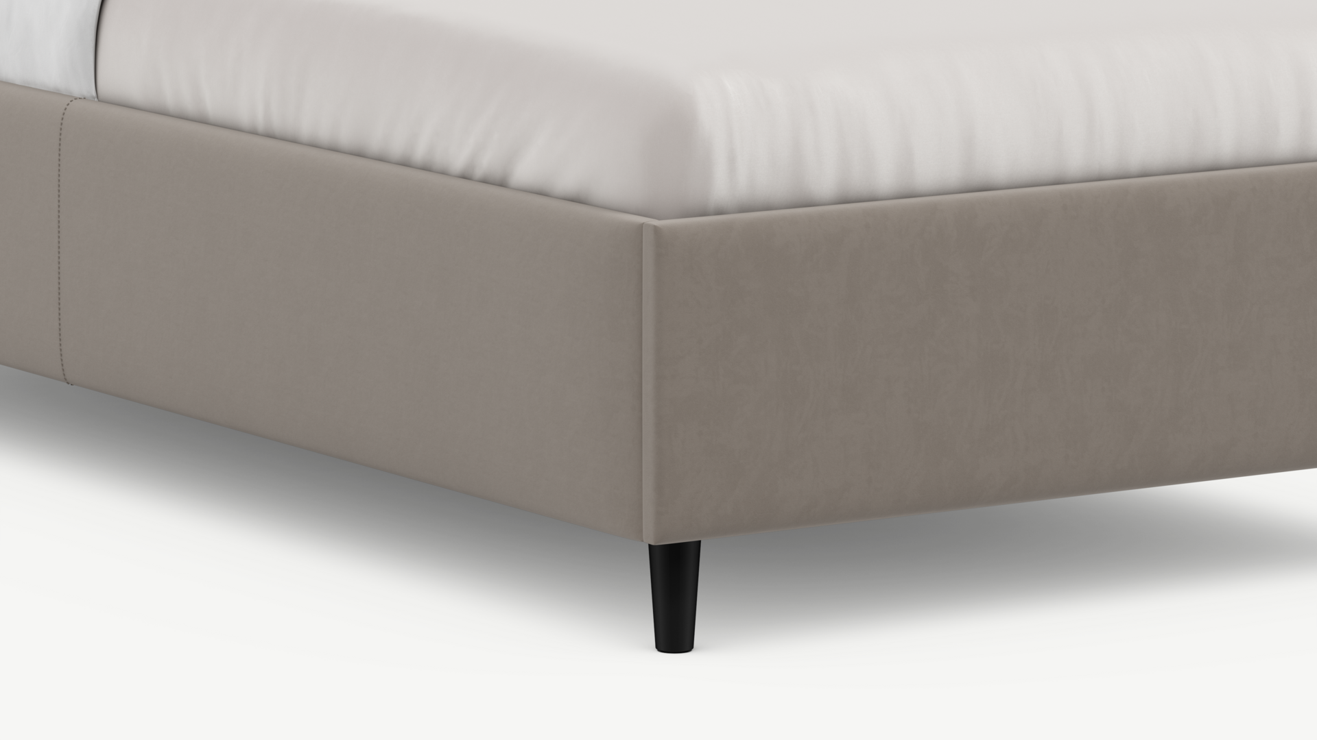 Царга, задающая пропорции, благодаря гладкости своей фактуры подчеркивает центральный элемент декора. Высокие опоры приподнимают фигуру кровати над полом и добавляют её образу визуальной легкости.