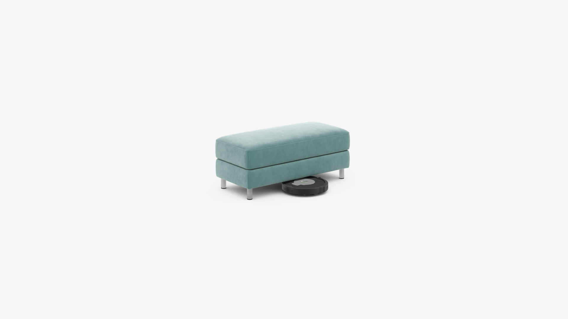 Под банкеткой с высокими цилиндрическими опорами проходит робот-пылесос.