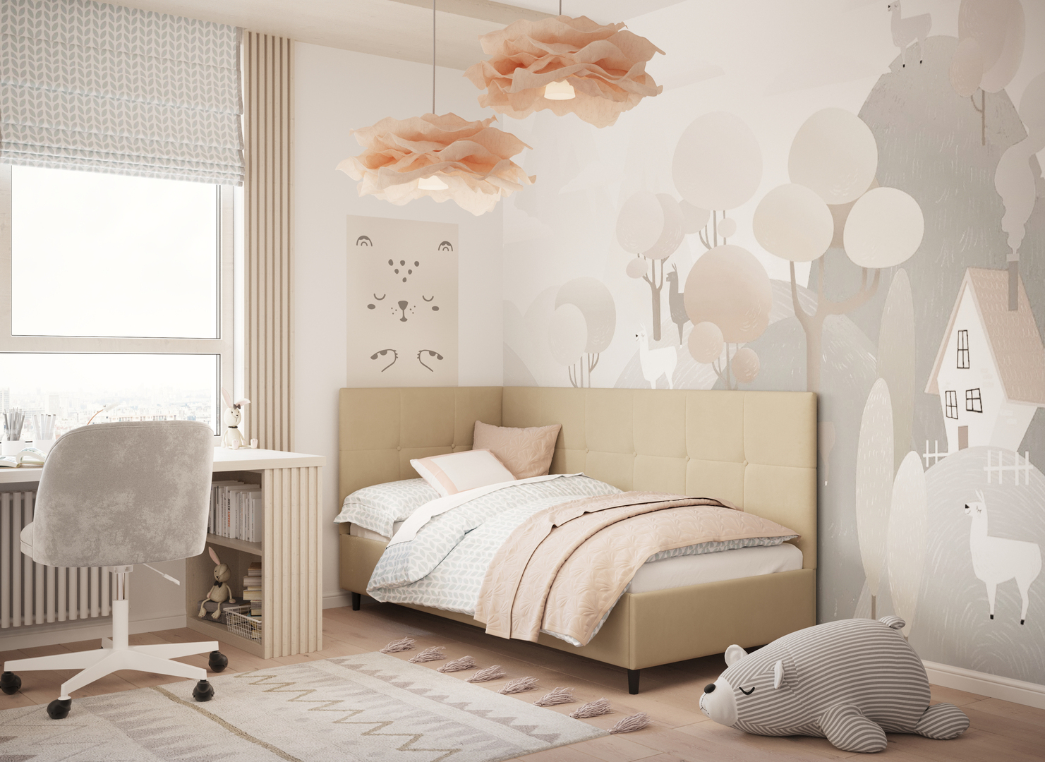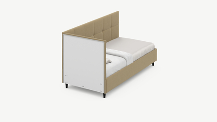 Угловая односпальная кровать MOON FAMILY 1261 с мягкой спинкой и изголовьем создаст в Вашей спальне ощущение уюта. Крупная квадратная стежка привносит в интерьер графических акцентов, а вставка из пуговиц наполняет пространство ощущением домашнего тепла.