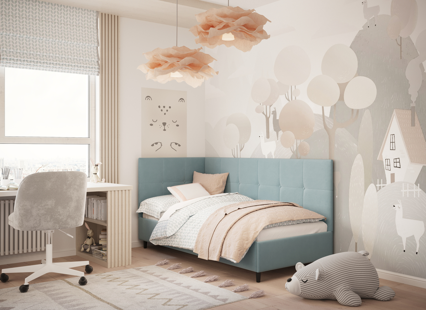MOON FAMILY 1261 объединяет функциональность и стиль, создавая гармоничное пространство для отдыха и творчества. Кровать доступна в левостороннем и правостороннем исполнении, что позволяет легко адаптировать ее под любые интерьерные особенности.