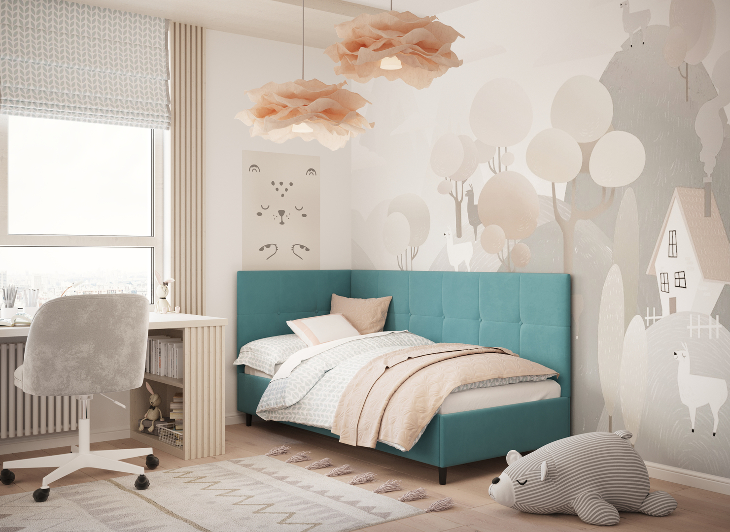 Угловая односпальная кровать MOON FAMILY 1261 с мягкой спинкой и изголовьем создаст в Вашей спальне ощущение уюта. Крупная квадратная стежка привносит в интерьер графических акцентов, а вставка из пуговиц наполняет пространство ощущением домашнего тепла.