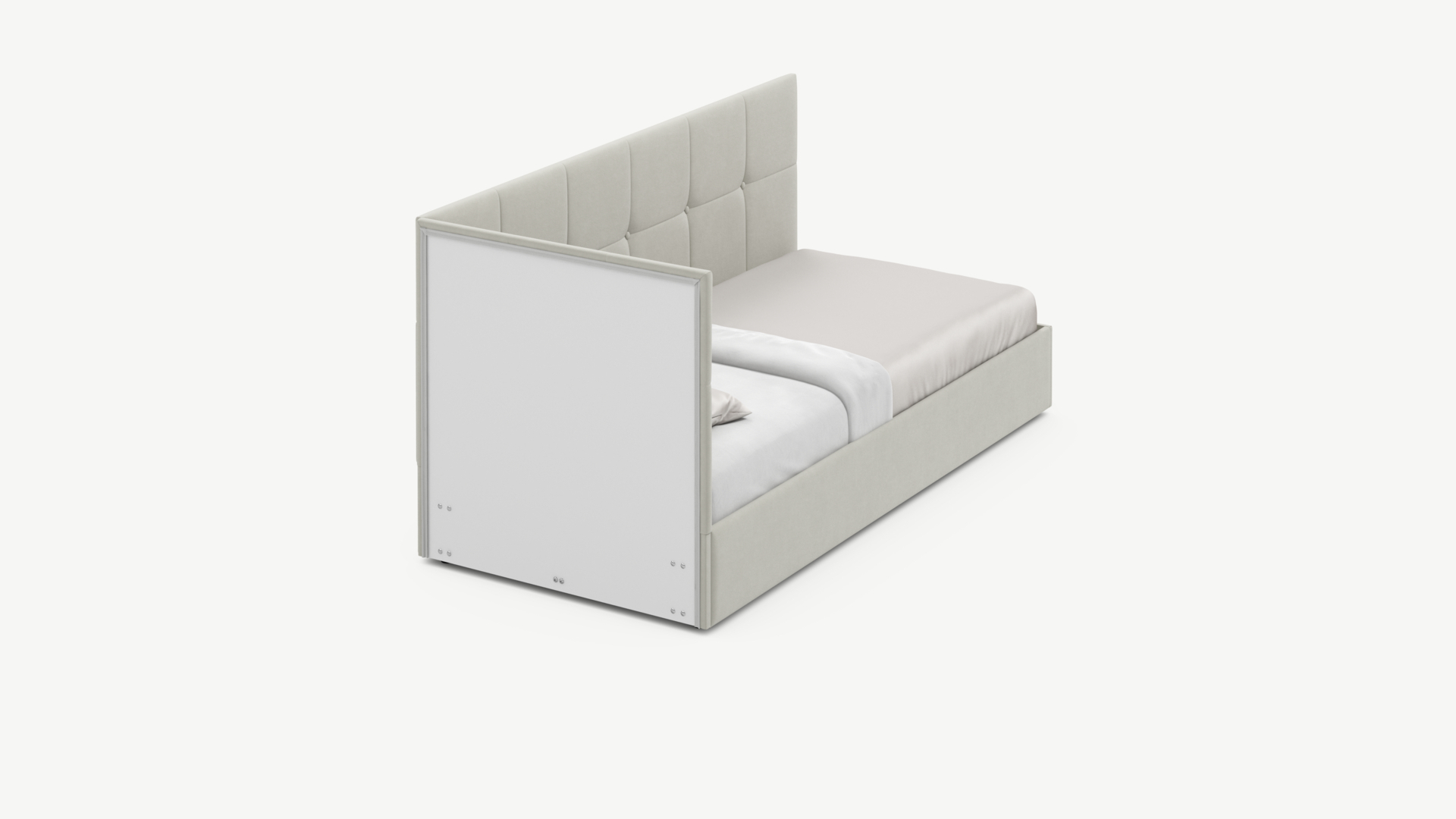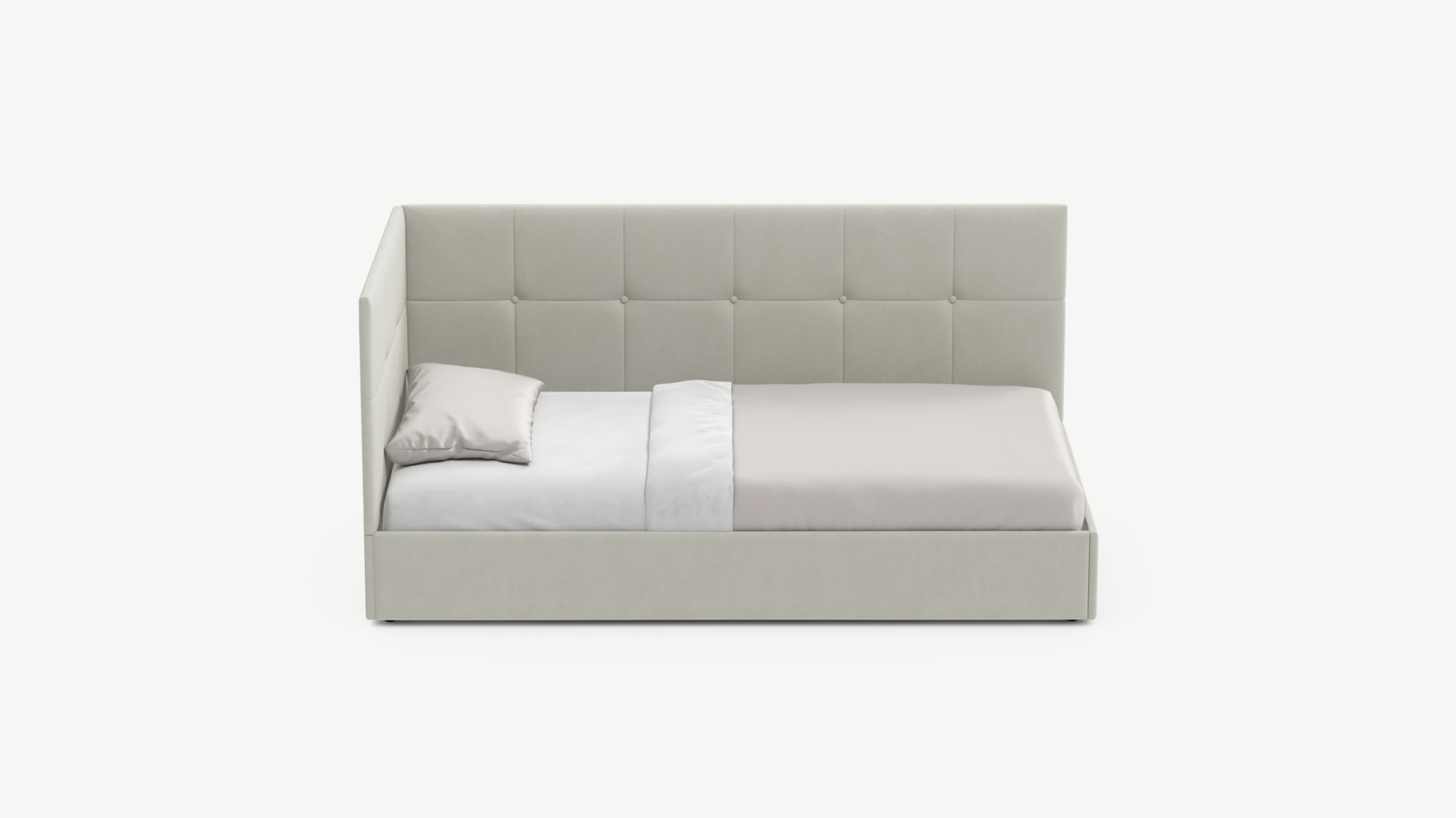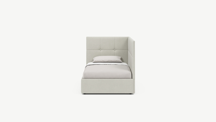 Угловая односпальная кровать MOON FAMILY 1261 с мягкой спинкой и изголовьем создаст в Вашей спальне ощущение уюта. Крупная квадратная стежка привносит в интерьер графических акцентов, а вставка из пуговиц наполняет пространство ощущением домашнего тепла.