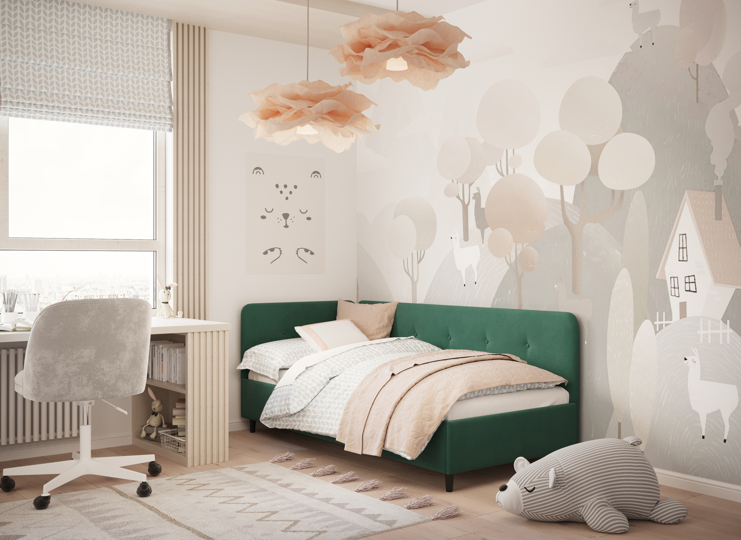 Угловая односпальная кровать MOON FAMILY 1253 с мягкой спинкой и изголовьем обладает округлыми формами, привносящими в интерьер нотки нежности. Изголовье, украшенное пуговицами, добавляет окружающему пространству шарм и уют. Высокие опоры придают кровати визуальной легкости, а также обеспечивают удобство во время уборки.