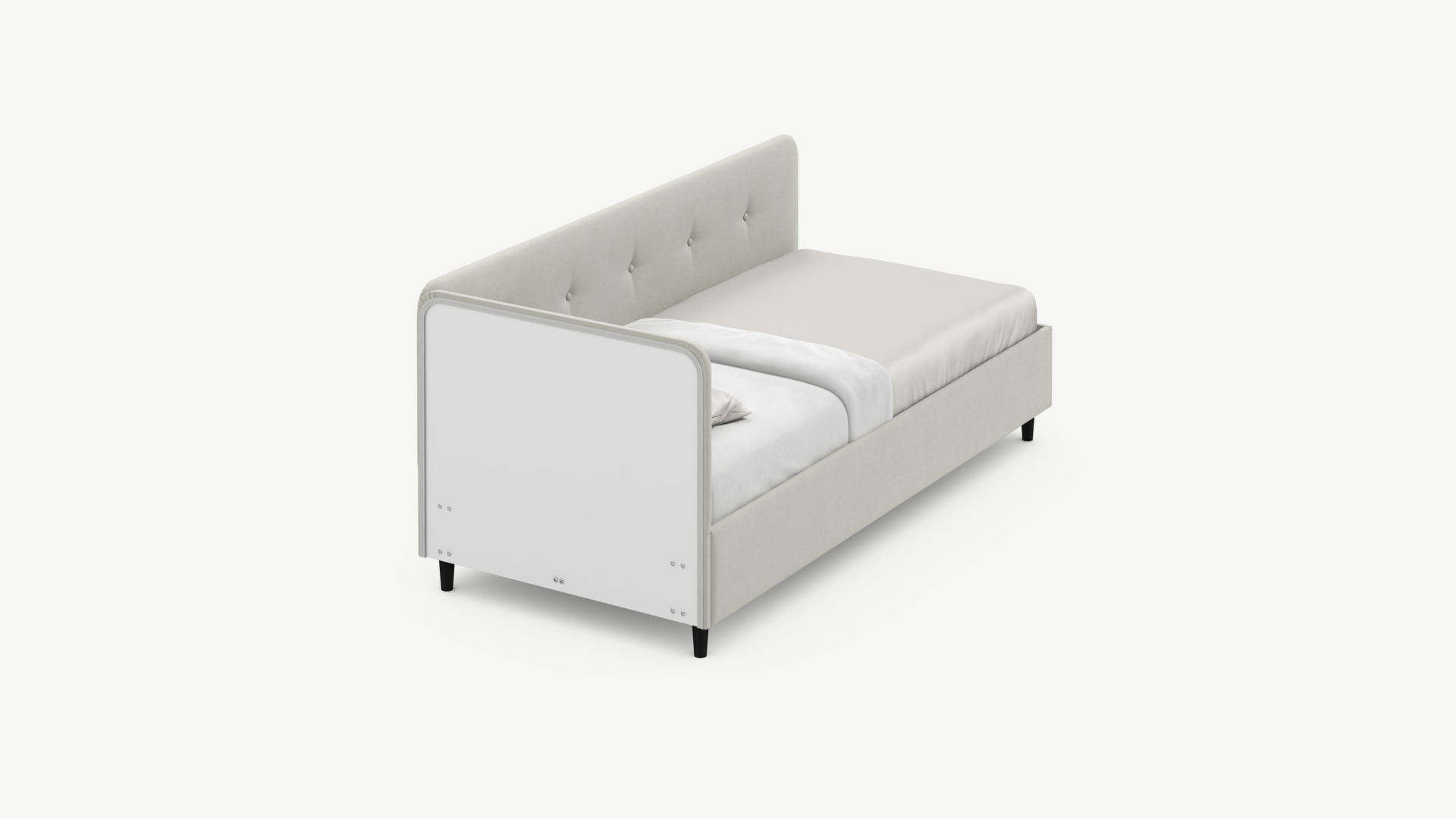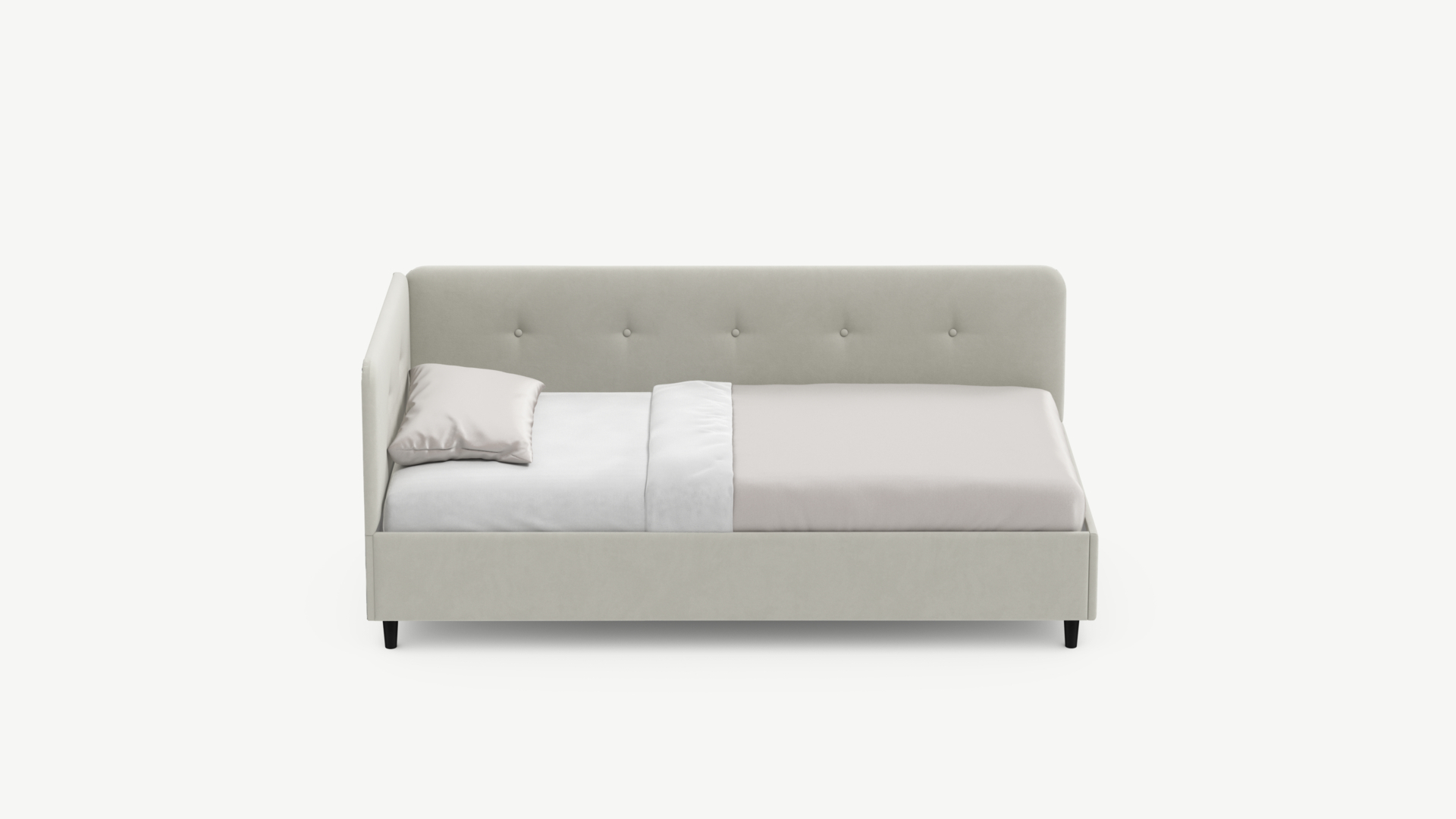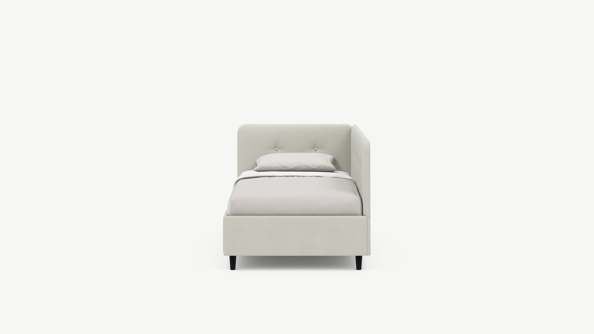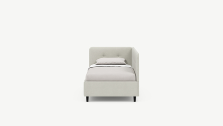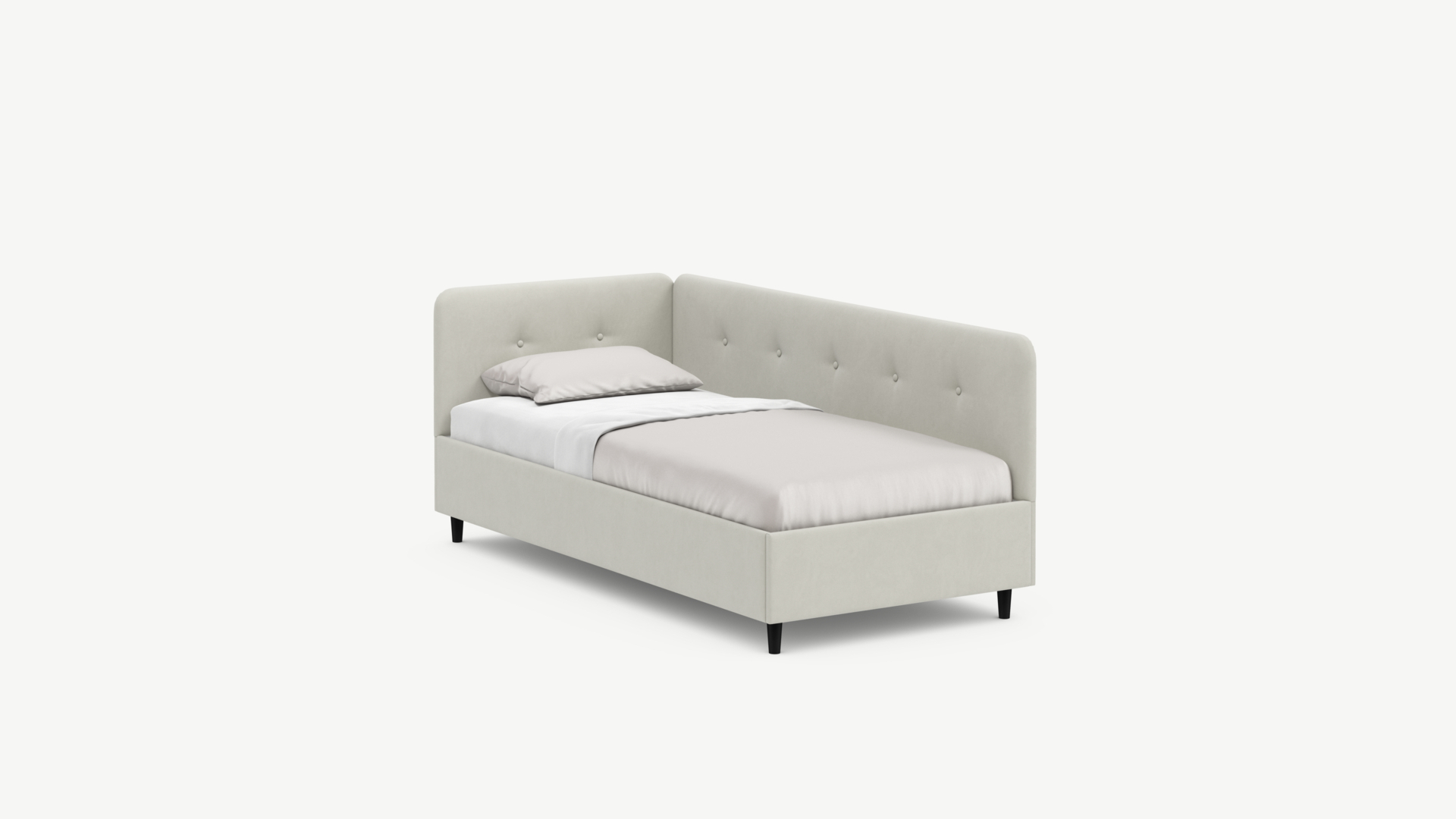 Угловая односпальная кровать MOON FAMILY 1253 с мягкой спинкой и изголовьем обладает округлыми формами, привносящими в интерьер нотки нежности. Изголовье, украшенное пуговицами, добавляет окружающему пространству шарм и уют. Высокие опоры придают кровати визуальной легкости, а также обеспечивают удобство во время уборки.