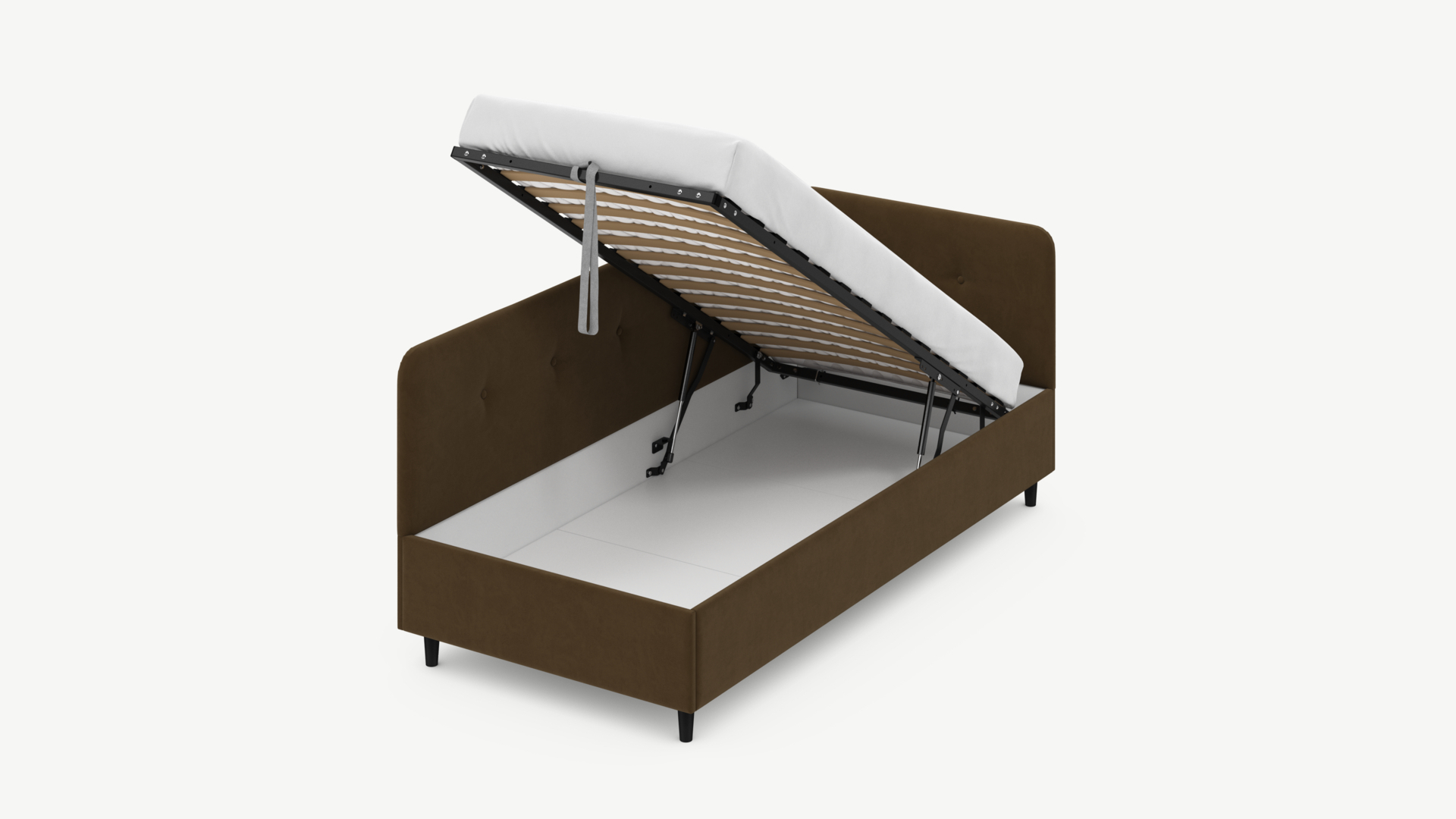 • Скрытая под основанием вместительная емкость без внутренних перегородок позволяет использовать всю площадь подкроватного пространства для хранения вещей.