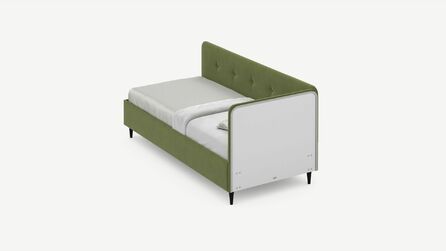 Угловая односпальная кровать MOON FAMILY 1253 с мягкой спинкой и изголовьем обладает округлыми формами, привносящими в интерьер нотки нежности. Изголовье, украшенное пуговицами, добавляет окружающему пространству шарм и уют. Высокие опоры придают кровати визуальной легкости, а также обеспечивают удобство во время уборки.