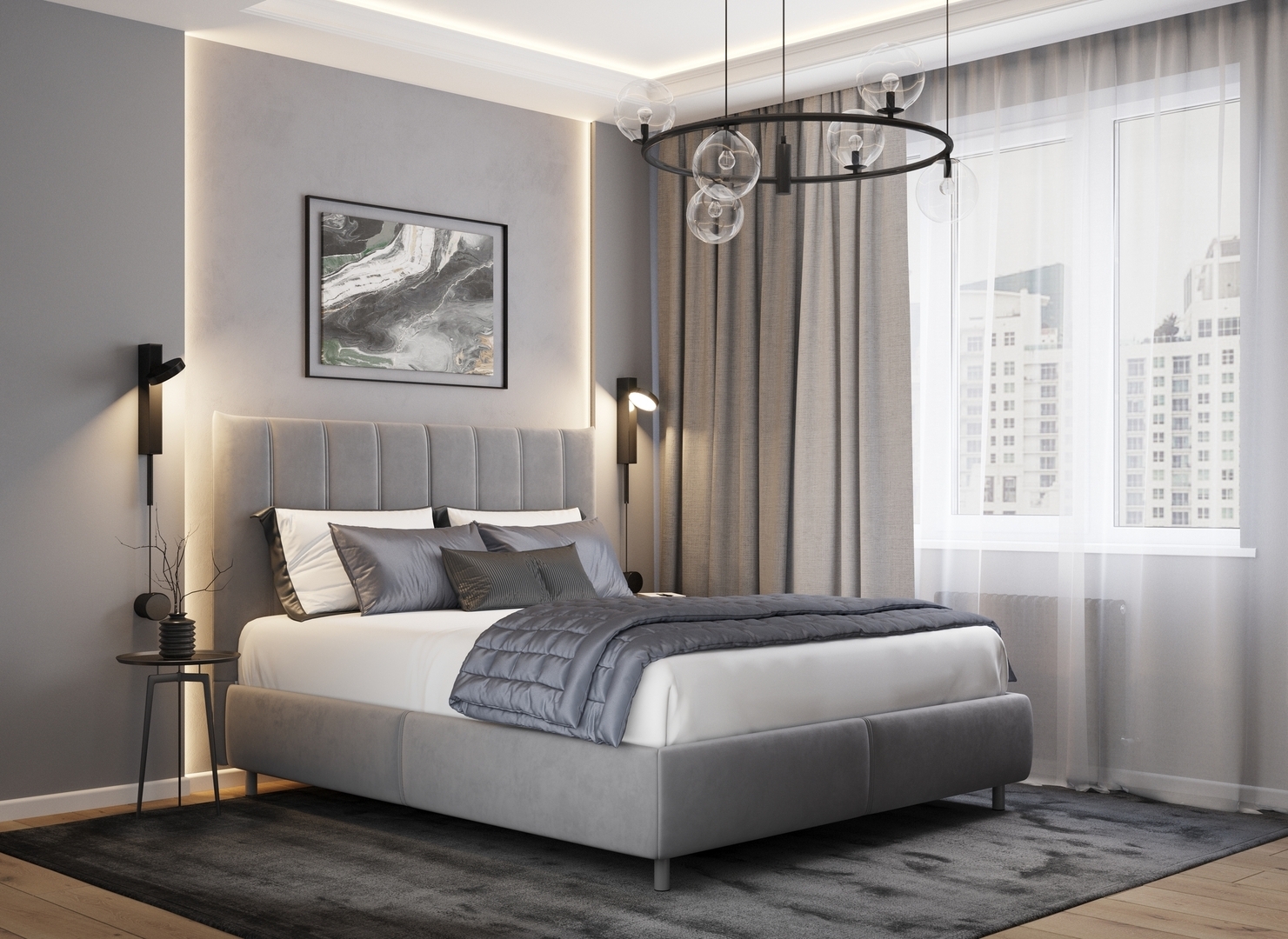 Творчески завершить образ спальни помогут дополнительные аксессуары: декоративные подушки и тумбы.